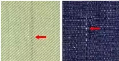 經(jīng)向疵點(diǎn):布面上由經(jīng)紗形成或沿經(jīng)紗方向形成的疵點(diǎn)。如缺經(jīng)、斷經(jīng)、粗經(jīng)、筘痕、雙經(jīng)、穿錯、吊經(jīng)、松經(jīng)等。