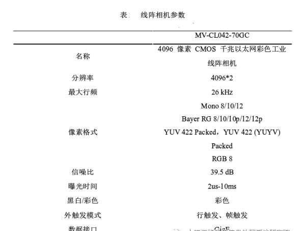 其中 Hc:線陣相機的每線像素數(shù)(單位:pixel),Lo:檢測物體的寬幅(單位:m),Vo:檢測物體運動速度(單位:m/s),Vc:行頻(單位:Hz,即 線/s)。求得本系統(tǒng)行頻需大于 4096Hz。因此,本文選用了海康威視數(shù)字技術(shù)股份有限公司生產(chǎn)的 CMOS 高速彩色工業(yè)線陣相機 MV-CL042-70GC,如下圖所示。
