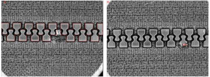 3.拉鏈檢測:可對各類型金屬、塑膠、尼龍拉鏈進行正反面鏈齒檢測,檢測是否缺失鏈齒,檢測鏈齒壓傷、劃傷不良等。