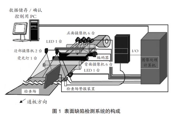 表面缺陷檢測系統(tǒng)的基本結構如圖1所示。這樣的構成裝置是,①攝像機和光源(LED、熒光燈等)、②圖像處理計算機、③數(shù)據(jù)儲存/確認控制用PC。表面缺陷檢測系統(tǒng)將攝像機拍攝到的被檢查對象的連續(xù)圖像輸送到圖像處理計算機,對圖像進行實時處理,根據(jù)圖像的色調深淺對缺陷進行判定檢查。檢查結果被輸送到數(shù)據(jù)儲存/確認控制用PC。PC上顯示出帶鋼展開圖和缺陷圖像,并保存在PC中。當檢查到缺陷時,警報器發(fā)出警告鳴聲。