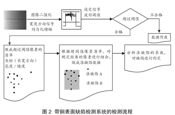 圖2是表面缺陷檢測系統(tǒng)判定缺陷方法的概略圖。將來自光源的透射光或反射光進行二值化處理后,利用軟件或光源輸出功率調整的方法使檢測信號增幅(標準化處理),然后對二值化信號設定閾值。對檢測出超過閾值的信號的像素位置信息和信號強度進行列表。根據(jù)規(guī)定條件,制成準缺陷圖像數(shù)據(jù)。利用準缺陷圖像的大小、形狀、色調深淺、位置等參數(shù)對檢測到的圖像進行細致判斷,判定檢測到的圖像是否是缺陷。