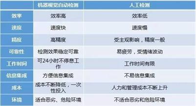 機(jī)器視覺(jué)優(yōu)勢(shì):機(jī)器視覺(jué)系統(tǒng)具有高效率、高度自動(dòng)化的特點(diǎn),可以實(shí)現(xiàn)很高的分辨率精度與速度。機(jī)器視覺(jué)系統(tǒng)與被檢測(cè)對(duì)象無(wú)接觸,安全可靠。人工檢測(cè)與機(jī)器視覺(jué)自動(dòng)檢測(cè)的主要區(qū)別有: