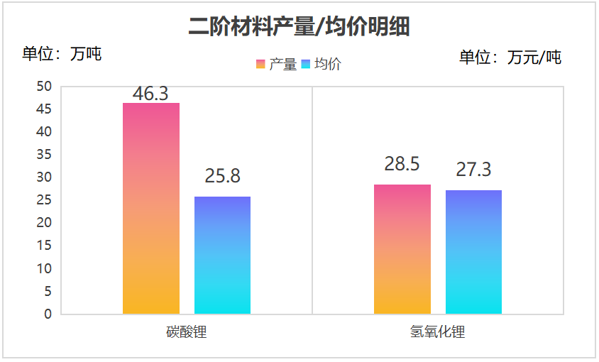 二階材料環(huán)節(jié),1—12月碳酸鋰、氫氧化鋰產(chǎn)量分別約46.3萬噸、28.5萬噸,電池級碳酸鋰、電池級氫氧化鋰(微粉級)均價(jià)分別為25.8萬元/噸和27.3萬元/噸。