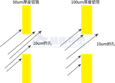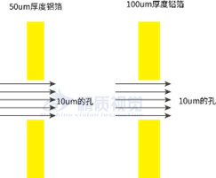 激光光源的發(fā)散角很小,幾乎是沿著平行方向發(fā)射的。不同厚度的鋁箔,同樣大小的針孔,檢測出來的孔洞面積是一致的。