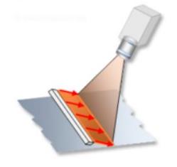 線掃描相機(jī)也可以用于實現(xiàn)暗場效果。為此,照明不會以反射角度對準(zhǔn)組件,而是明顯更平整。直接反射的光不會入射到相機(jī)上,因此像場顯得很暗,因此相機(jī)只能檢測到微弱的雜散光。該技術(shù)需要大量的光。刮痕,縫隙,高程或浮雕由于其表面不平整而在散射光時顯得明亮。檢測光滑材料表面缺陷的理想方法。