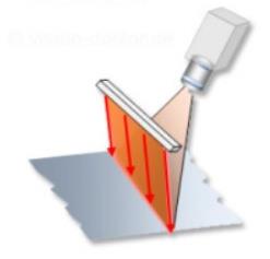 明場照明是使用線掃描相機(jī)進(jìn)行表面檢查的標(biāo)準(zhǔn)方法,攝像機(jī)和照明設(shè)備的布置方式應(yīng)使攝像機(jī)處于照明設(shè)備的反射角(入射角=反射角)。以這種方式,盡可能多的入射光被檢測到。這在反射材料的情況下特別有效。以這種方式,明亮的區(qū)域顯示為明亮,黑暗的區(qū)域為黑暗。如果表面結(jié)構(gòu)的角度不適合對齊而是傾斜,則它們在相機(jī)圖像中也會顯得很暗。表面的刮痕或傾斜的相位等在圖像中具有較深的灰色陰影。